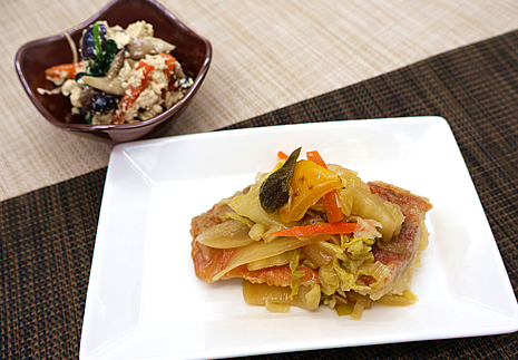 しっとりとマリネした赤魚を焼き上げ、旨みをとじ込めました。七種類の野菜は酢醤油で炒め、魚と合わせました。魚と野菜をバランスよく摂れる体想いの優しいお惣菜です。