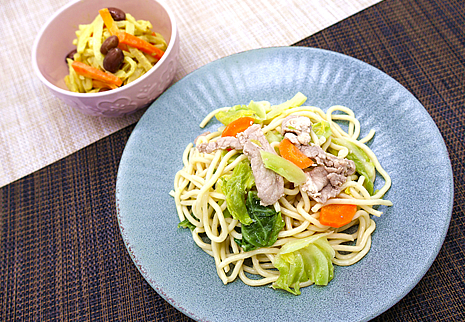 塩麹でやわらかな舌触りにした豚肉と、たっぷりのキャベツ、人参、きのこを、にんにくと唐辛子で炒め、茹でたスパゲッティに絡めました。彩り豊かな野菜が食欲をそそります。