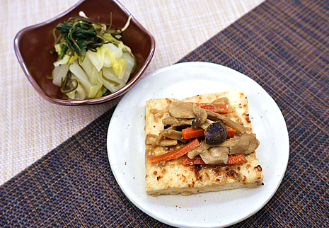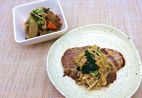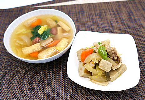 根菜と天童牛肉の炒め煮に、高野豆腐を小さくカットして加え、カルシウム量を高めています。モソモソした印象のある高野豆腐ですが、噛むと野菜や牛肉のうま味がしみ出し、食べやすい食感になっています。