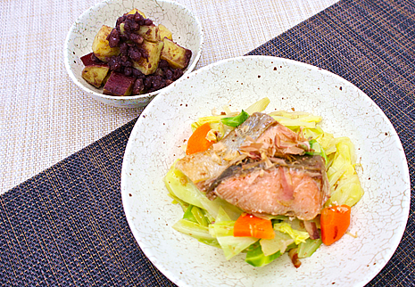 北海道の白鮭は、下味をつけて熟成させてから焼きました。たっぷりのキャベツ、玉ねぎ、人参を炒め、鰹節をまぶして鮭と合わせています。お野菜をしっかり摂れる嬉しい一品です。