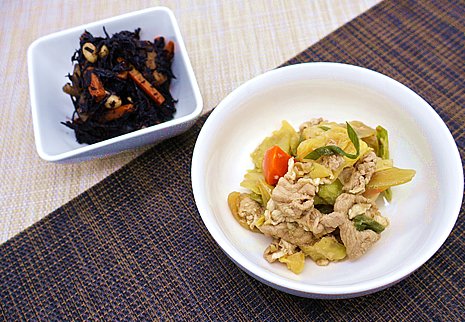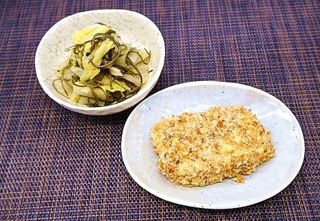 原材料(副菜):(すべて国産)白菜、しめじ、 刻み昆布、米酢、醤油、ごま油、 食塩(一部に小麦、大豆、ごまを含む)