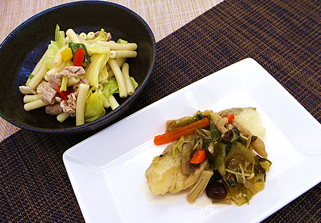 ●原材料(副菜):(すべて国産)キャベツ、マカロニ、 ピーマン、豚肉、にんにく、米油、 食塩、鷹の爪(一部に小麦、豚肉を含む)