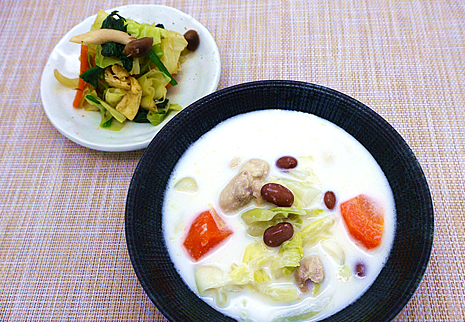 ●原材料(主菜):牛乳(国産)、鶏肉、キャベツ、 玉ねぎ、人参、金時豆、小麦粉、バター、寒こうじ、 コンソメ、食塩、米油、てんさい糖、胡椒 (一部に乳成分、鶏肉、小麦、大豆を含む)
