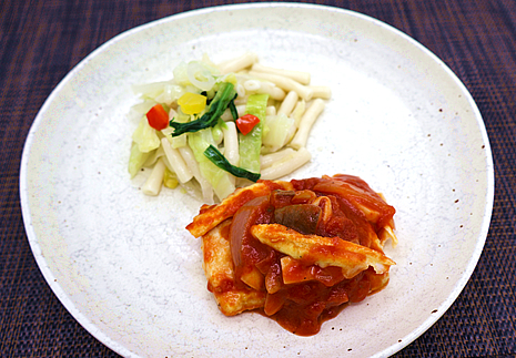 ●原材料(副菜):キャベツ(国産)、マカロニ、 玉ねぎ、ほうれん草、ピーマン、にんにく、 米油、食塩、粉バジル、胡椒(一部に小麦を含む)
