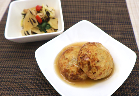 菜彩鶏肉にごぼう、人参、玉ねぎ、山形車麩、豆腐を加えて、つくねにしました。ひとつひとつが大きめで、野菜もたっぷり入っています。食べ応えのある、満足感たっぷりの一品です。