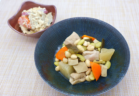 菜彩鶏肉とたっぷりの根菜を、かつおと昆布の濃厚なお出汁でじっくり和風煮にしました。お豆と高野豆腐もごろごろ入って、旨味も栄養もたっぷり、ほっとする味わいです。