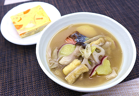 鮭は下味をつけて熟成させた後、さっと焼いて旨みを閉じ込めました。れんこん、さつま芋、ごぼう、しめじなどの秋野菜を味噌仕立てにし、焼き魚を合わせて味を含ませています。心も体もほっこりと温まります。