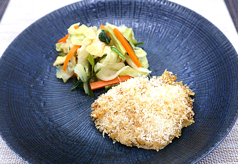 二晩じっくり漬け込んだ菜彩鶏のむね肉は、味が入ってしっとりとした食感に仕上がっています。パン粉をふって香ばしく焼き上げました。良質なたんぱく質を含むむね肉は、お子様からご年配の方まで、幅広い世代に人気です。お弁当のおかずにもおすすめです。