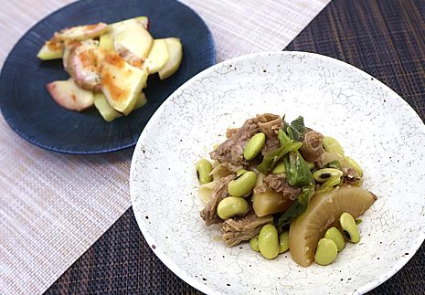 天童黒毛和牛のすじ肉は、時間をかけて丁寧に下茹でしました。主役の大根は大きめに切り、牛すじ肉とともにお醤油でじっくり含め煮にしています。野菜には牛肉のまろやかな旨みがしっかりと染み込み、ご飯が美味しく進みます。