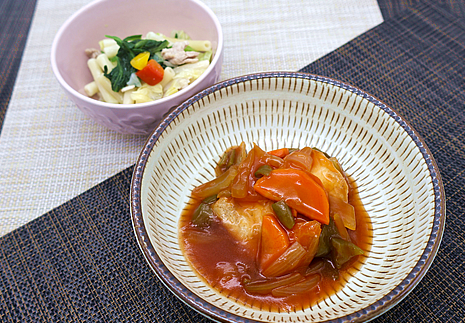 鶏肉はマリネにしてしっとりと一工夫、玉ねぎ・人参・ピーマンのソースをのせました。甘酢の照りが食欲をそそるお惣菜です。野菜の彩りも鮮やかで、食卓がぱっと明るくなります。
