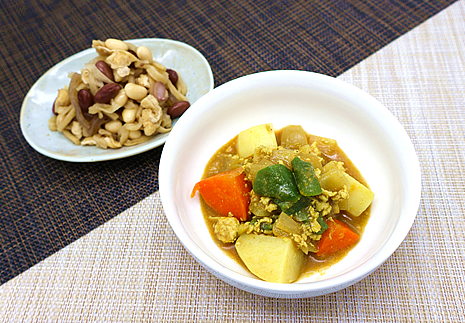 根菜と天童牛肉の炒め煮に、高野豆腐を小さくカットして加え、カルシウム量を高めています。モソモソした印象のある高野豆腐ですが、噛むと野菜や牛肉のうま味がしみ出し、食べやすい食感になっています。