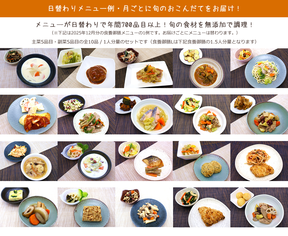 主菜5品目・副菜5品目の全10品でご提供いたしております。